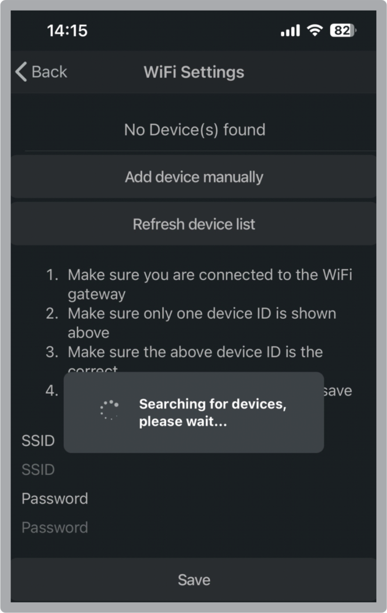 - De app zal automatisch beginnen zoeken naar de Wi-Fi Gateway. U ziet bovenaan de ID nummer verschijnen wanneer de Wi-Fi Gateway gevonden is.